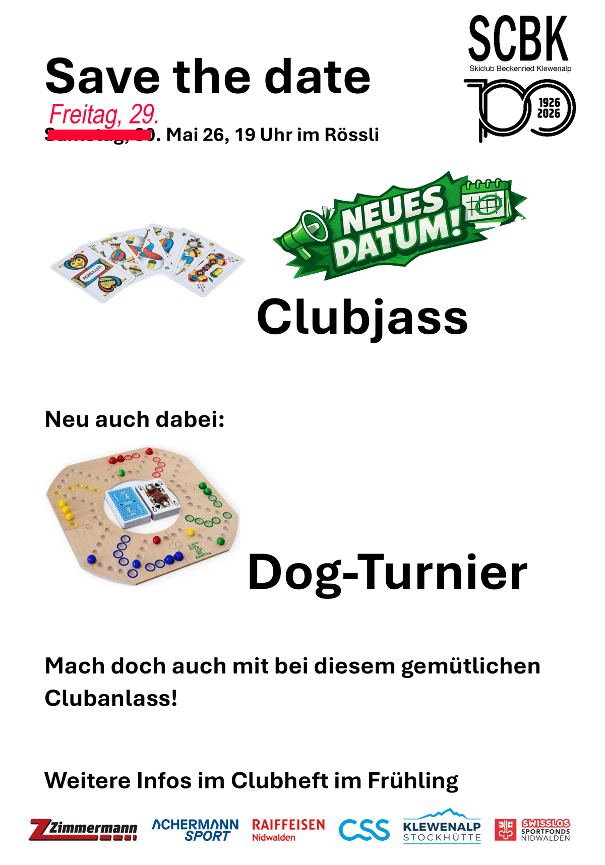 Wer wird Jassmeister/in und/oder Dog-Meister/in? Finden wir es am 29.05.2026 gemeinsam raus! Mach doch auch bei einem der beiden Turniere mit. Mehr Infos folgen - reserviere dir aber schon mal den Freitag, 29. Mai 2026, 19:00 Uhr in deinem Terminkalender!